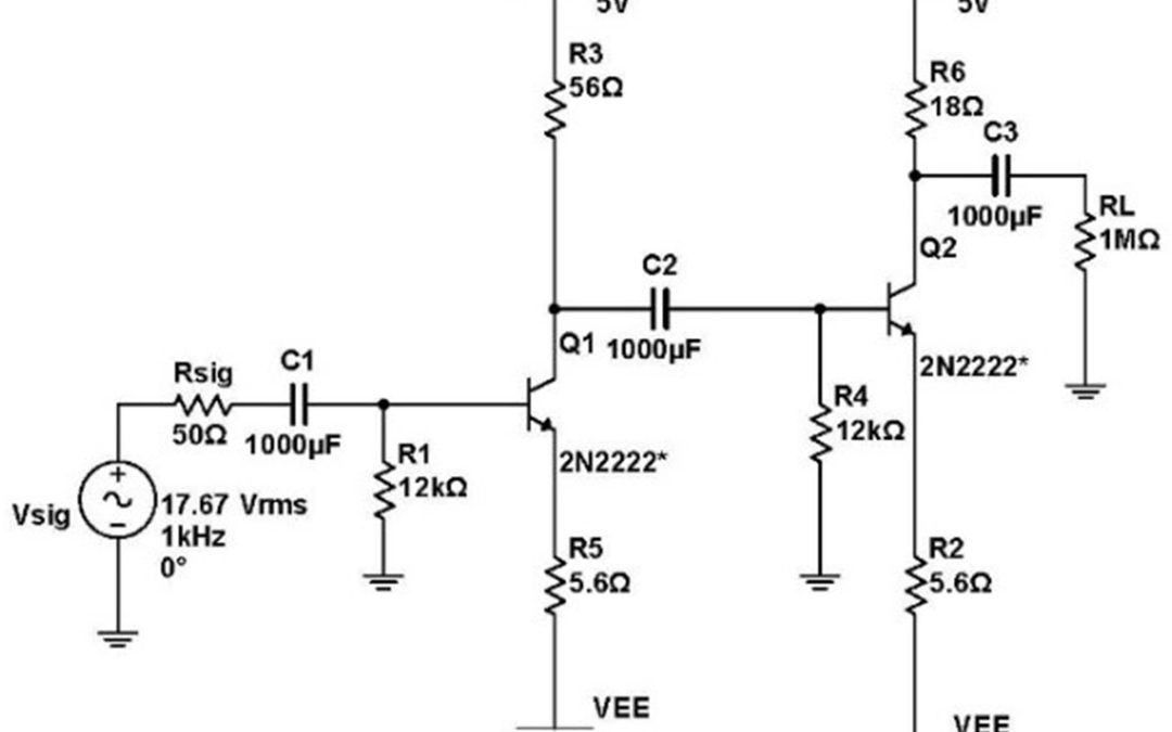 Implementation of Two-Stage Amplifier using 2N2222 BJT